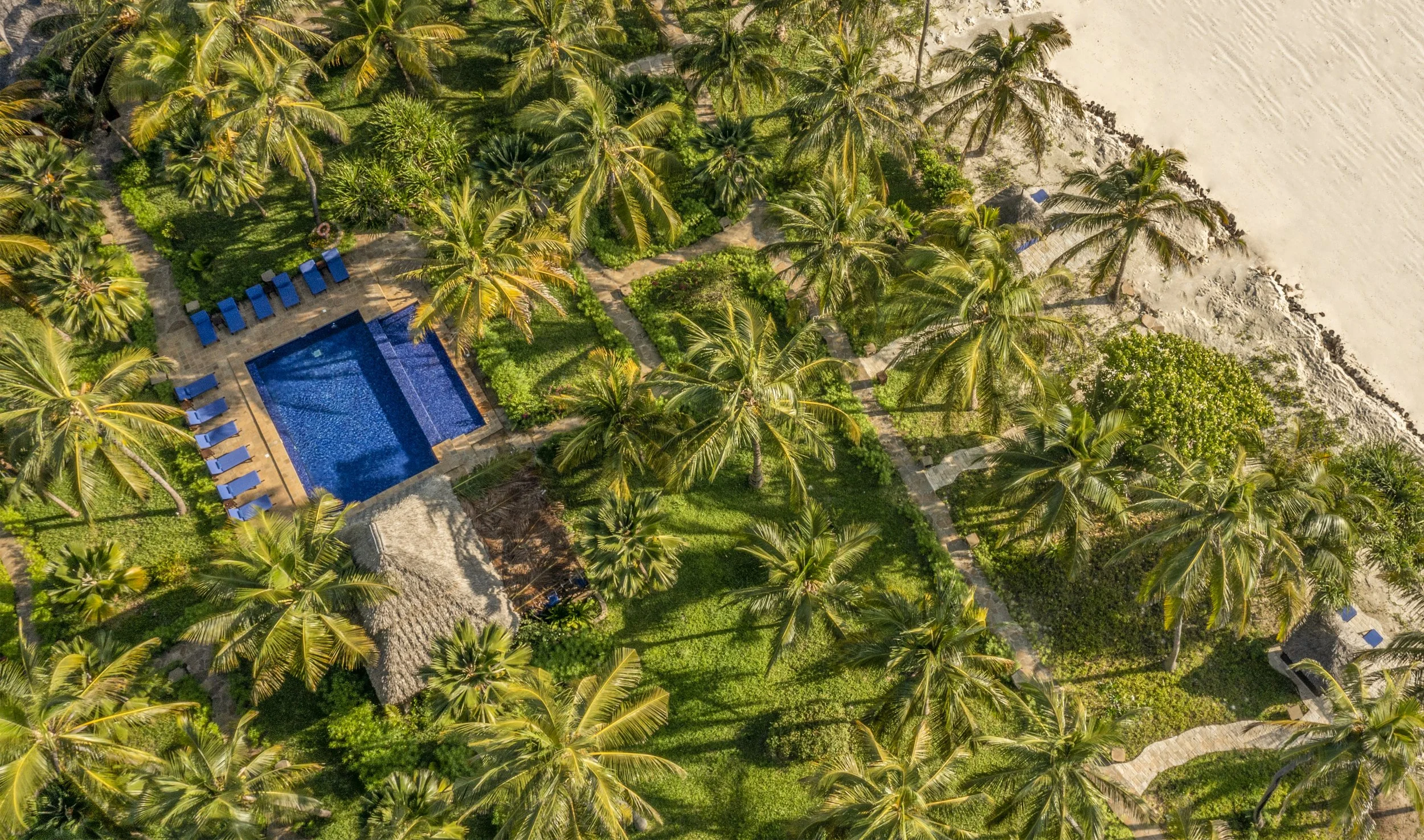 The Palms comprises seven exceptionally spacious beachfront villas, each crafted in an elegant Swahili-coastal style and positioned to offer tranquil Indian Ocean views. Every villa features a master bedroom, a separate living and dressing area, a luxurious bathroom with walk-in shower and soaking tub, plus an expansive private terrace framed by palms and sea breeze.