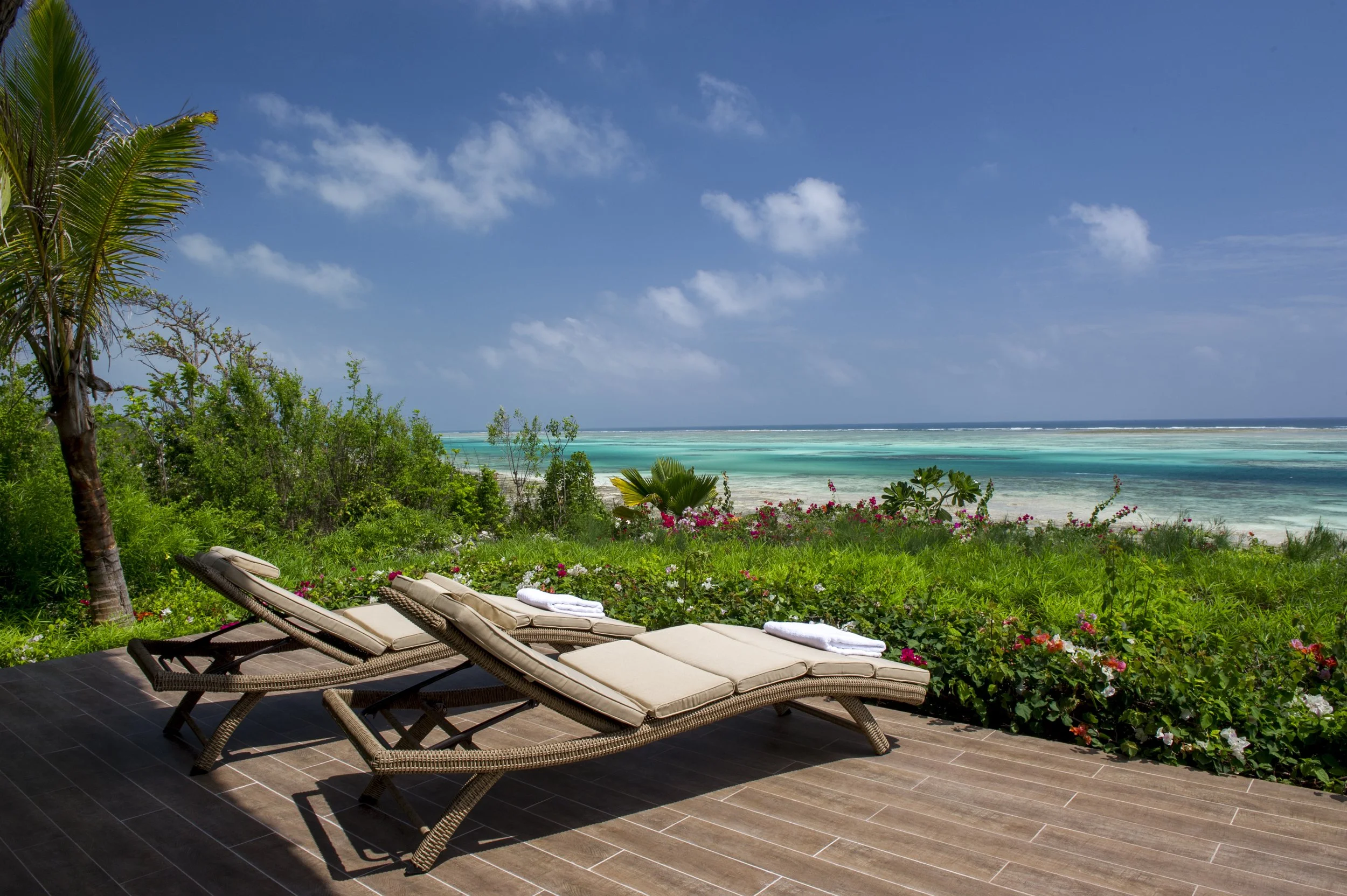 Zawadi features twelve spacious, ocean-facing private villas, each designed in an elegant driftwood-beach style and positioned to capture uninterrupted Indian Ocean views. Every villa includes a master bedroom, a generous living/seating area, a large bathroom with freestanding bathtub and walk-in shower, as well as a wide private terrace surrounded by bougainvillea and palms.